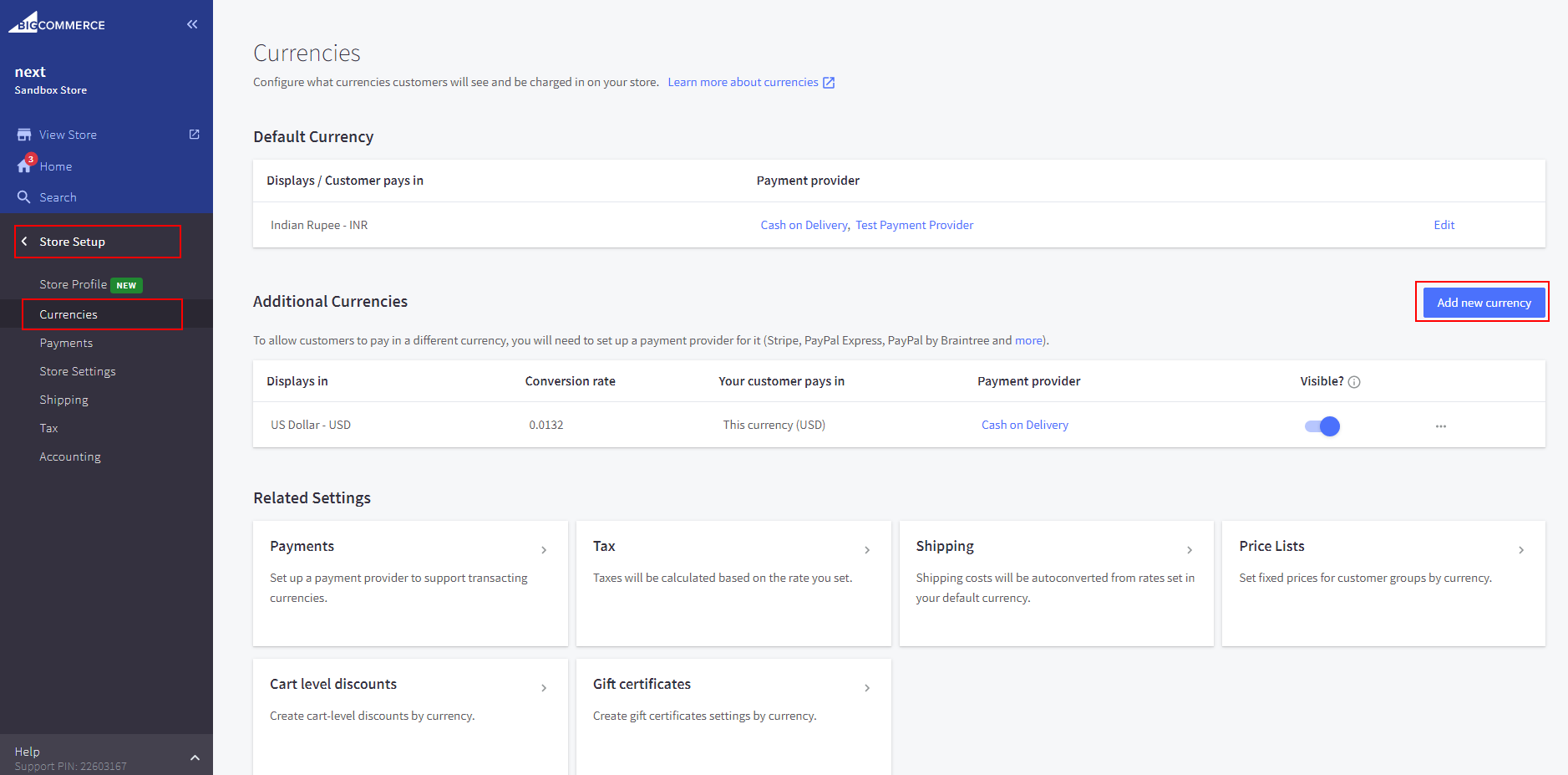 To add currency, Go to Store Setup > Currencies. Click on "Add new currency" button.