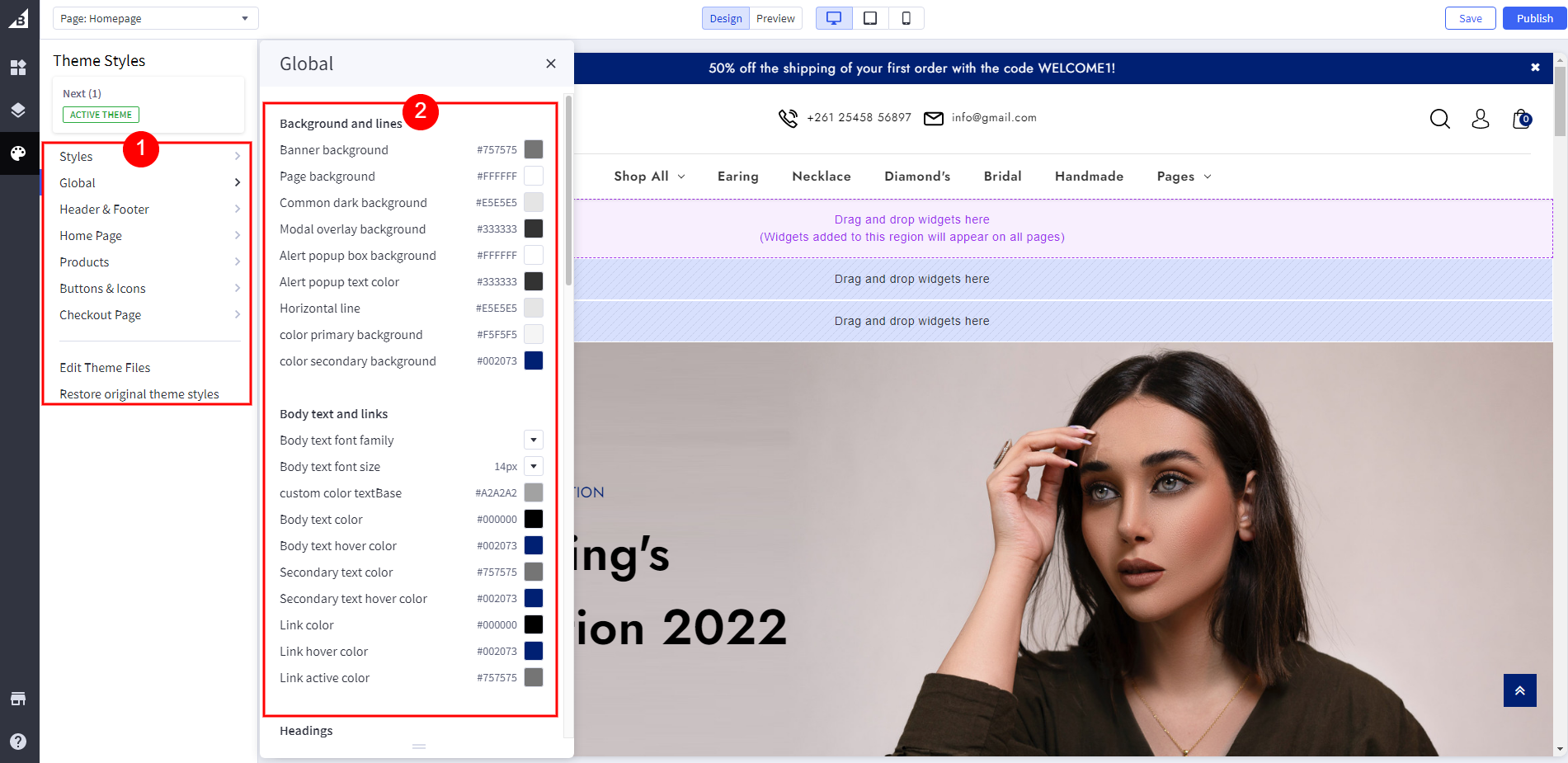 Customzing Typography, Fonts and Colors, Buttons in Page Builder > Theme Styles > Global. There are dozens of options to help you customize your website beautifully and uniquely.