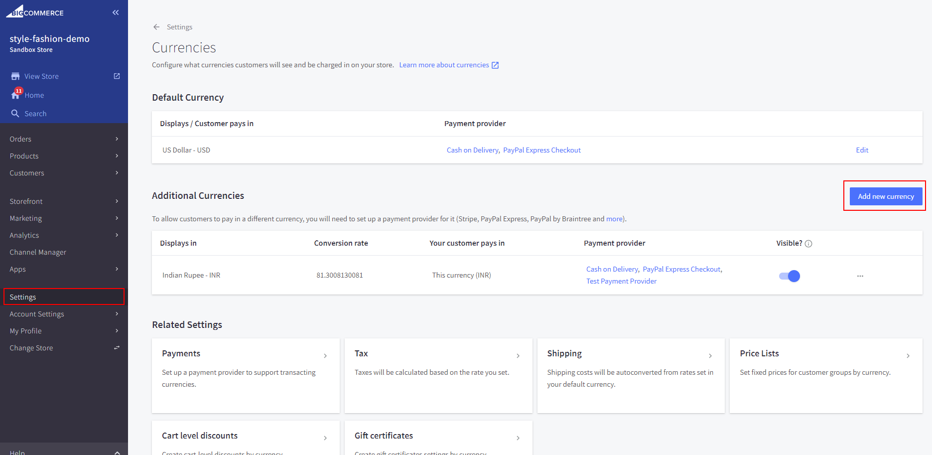 To add currency, Go to Settings > Currencies. Click on "Add new currency" button.