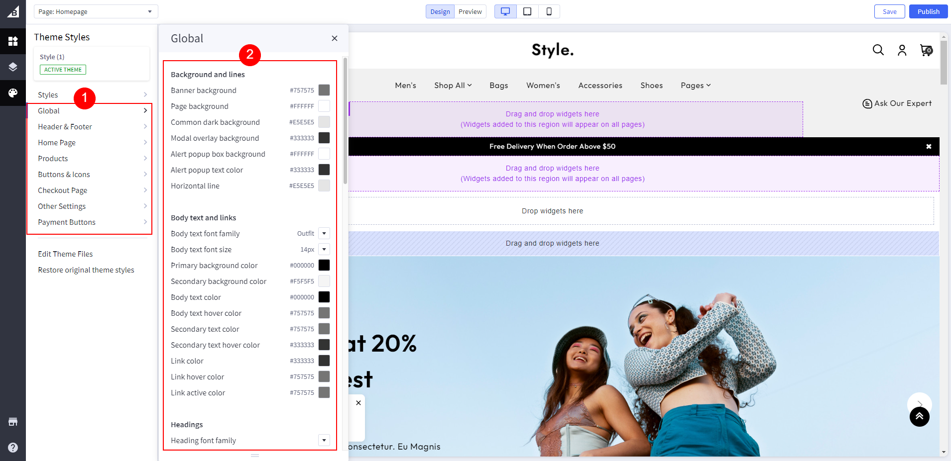 Customzing Typography, Fonts and Colors, Buttons in Page Builder > Theme Styles > Global. There are dozens of options to help you customize your website beautifully and uniquely.