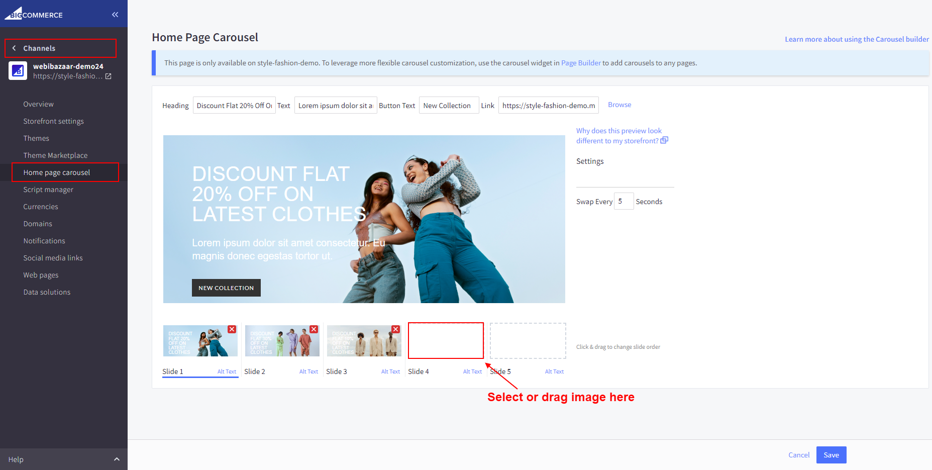 In Admin panel > Go to Channel Manager > Edit storefront settings > Home Page Carousel.