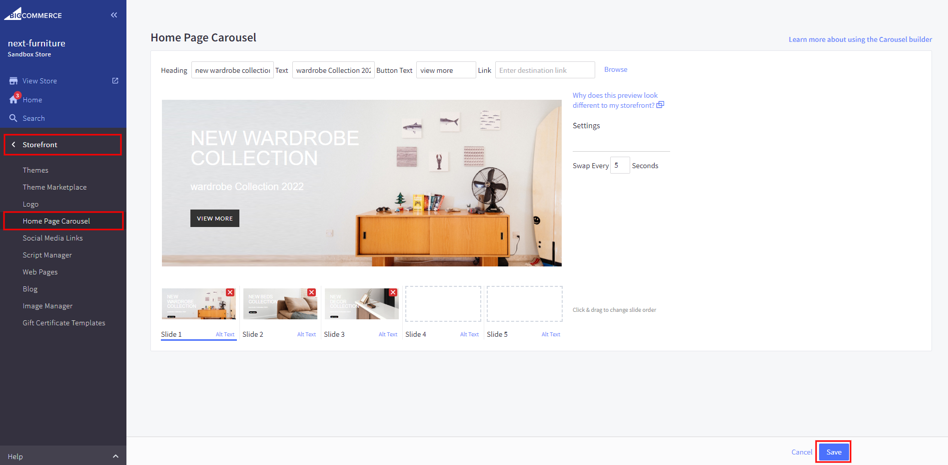 In Admin panel > Go toStorefront > Home Page Carousel.