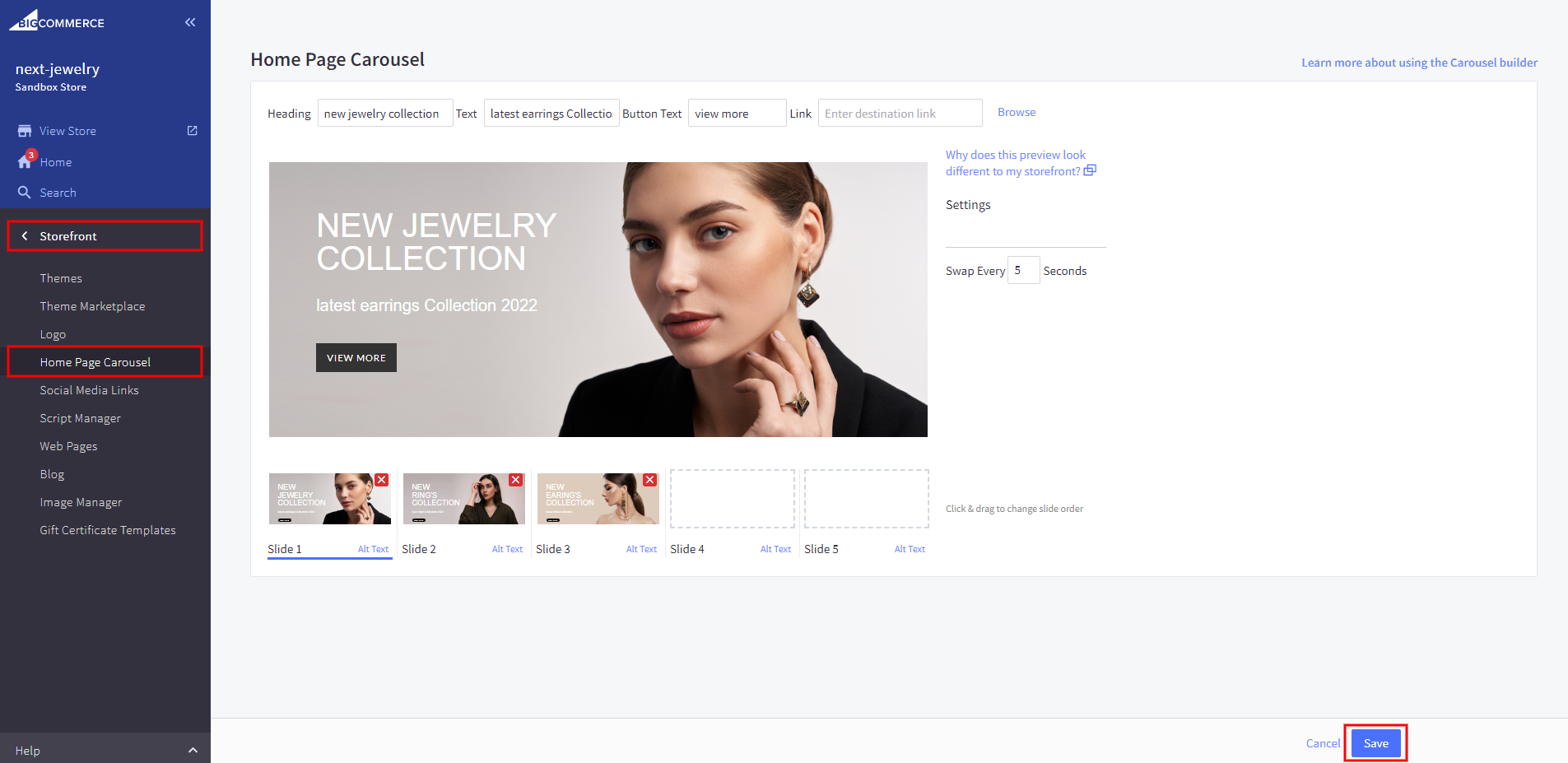 In Admin panel > Go toStorefront > Home Page Carousel.