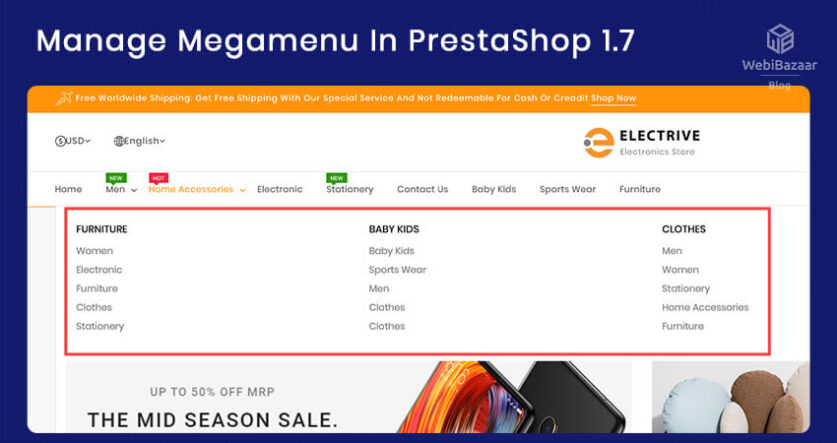 Webibazaar Templates provides many eCommerce Web Templates eCommerce platforms on Best PrestaShop Themes, Responsive BigCommerce Themes, Shopify Themes, OpenCart Themes, WooCommerce Themes. Manage Megamenu in PrestaShop 1.7 Theme is Easy to use and you can add each category in Menu. You Can also add your own link and cms block to Menu. If you want […]