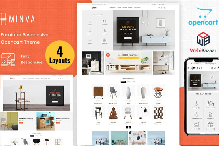 By downloading Minva Opernacrt theme, you get more than what you pay for. It’s a multi-purpose eCommerce design that includes 4 ready-to-go homepage layouts. The fully responsive theme’s layout structure makes your furniture or interior design project look stunning on mobile and desktop devices. It also features multi-currency and multi-language support, making it more convenient for your customers to browse your site and complete orders most conveniently. The theme features a fully customizable layout. You can apply changes to every element of its pre-designed pages. Besides, the Minva theme is bundled with lots of handy eCommerce elements, which let you easily build a conversion-oriented website.