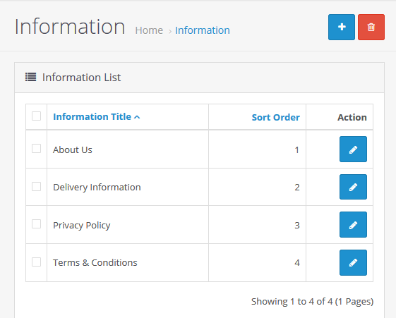 In Opencart, it is referre to as “Information pages”. To manage information pages open your Opencart admin panel and go to the CatalogInformation section :