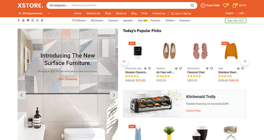 eMarket WooCommerce theme is specially designed for creating any type of marketplace website and niche-based website. It theme comes with 30+ homepage layout designs and 3 mobile layouts. This theme is suitable for businesses like fashion stores, furniture stores, book shops, cosmetics stores, etc.