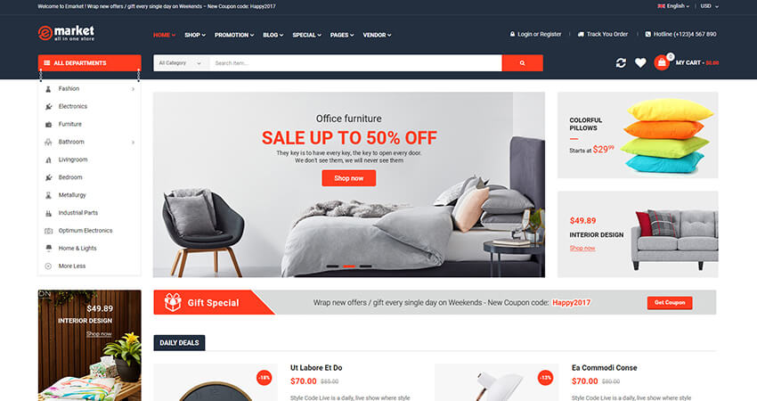 This theme comes with 50+ different layouts which include furniture, fashion, supermarket, multi-vendor marketplace layouts.