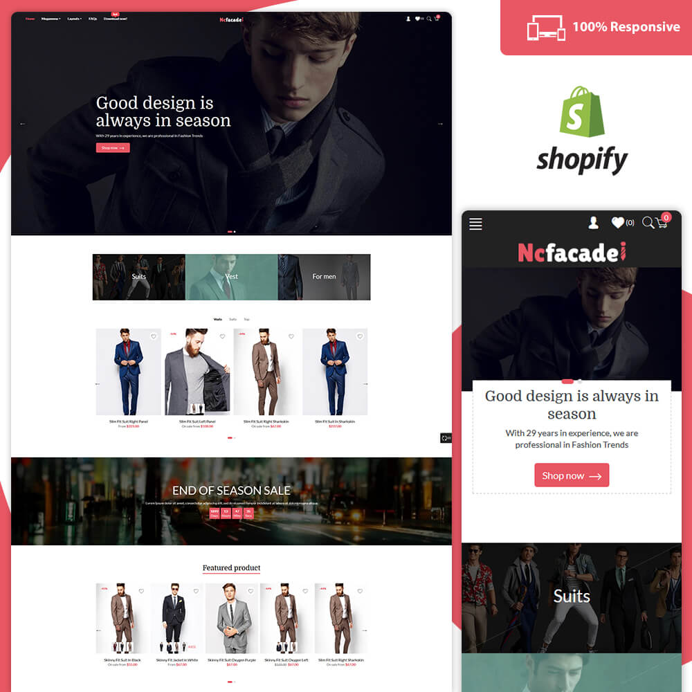 Nc-facade Free Shopify Theme Fashion it is a simple and clean layout with elegant design, very easy to install and to use. No HTML knowledge requries, easy to install and easy to use.It has been built with mobile users in mind. So it looks great on desktops, tablets and mobiles.Fashion is an awesome,robust and flexible theme with a design and all fearture of online category and fully customize,suitable for E-commerece website. It is a dedicated to fashion,Jewellery,Cosmetic,Home appliances,Bag,Organic,Resturant,Watch,Fashion,Ceramic,Flower,Shoes,Power-Tool,Pet-Store.
